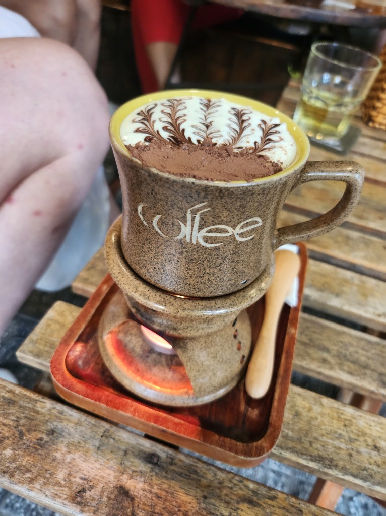 When my cà phê trứng arrived to my table it was cradled in a beautiful ceramic vessel, labeled COFFEE quite clearly and beautifully. It was heated in front of me over a tea candle, and had a quick sprinkle of cocoa over the top of the egg foam along with a chocolate syrup flourish. After the beverage was heated, I mixed and took a sip of some of the sweetest, creamiest coffee I’ve ever had.