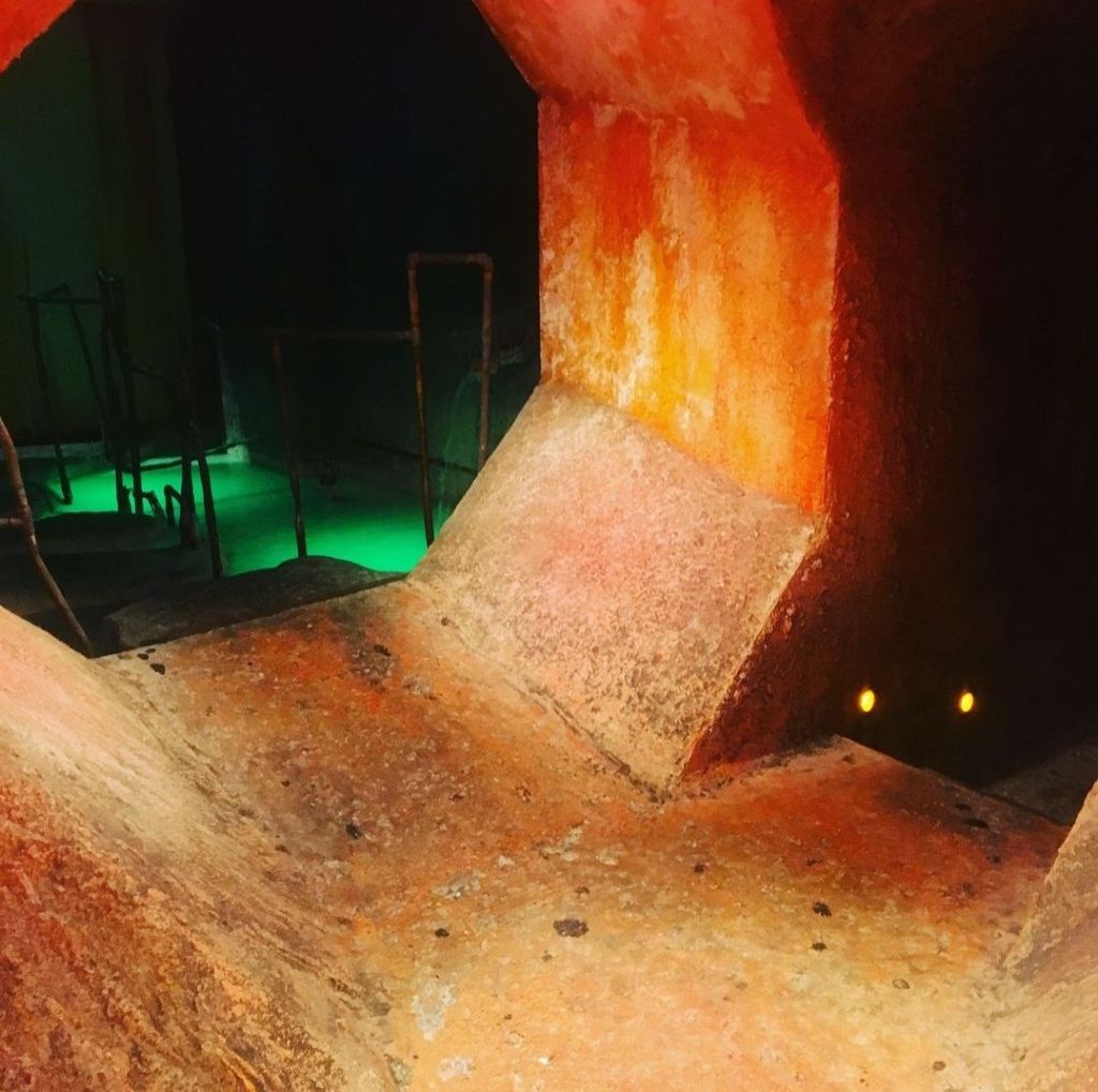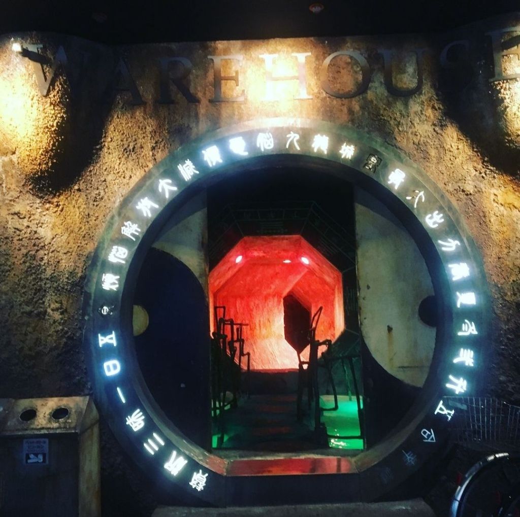 With his mischief making smile still painting his face, Steve led the way to a steel door tunneled entrance lit with red lines and spray painted with the words, “Kawasaki warehouse” painted on it. I jumped back as the door suddenly slid back revealing dingy neon signs buzzing walls covered in soot and grime. The stink of stale cigarettes hung in the air and as we continued down a narrow dim hallway I really started to get nervous about what kind of adventure Steve was leading me into. After a short way, before us was an engraved glowing archway that led to a giant vat of glowing green liquid, with only small stepping stones and railings to provide a path across.