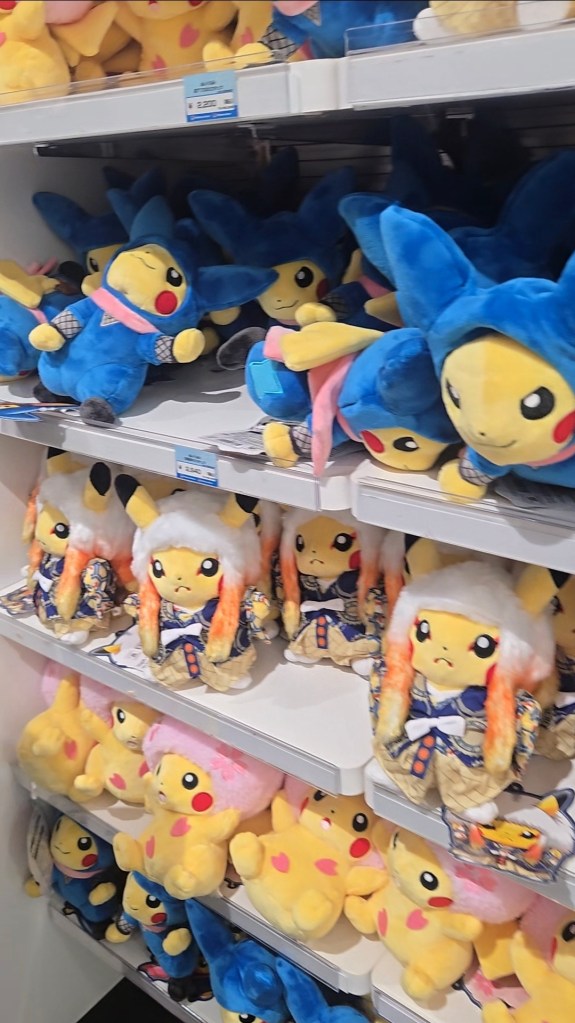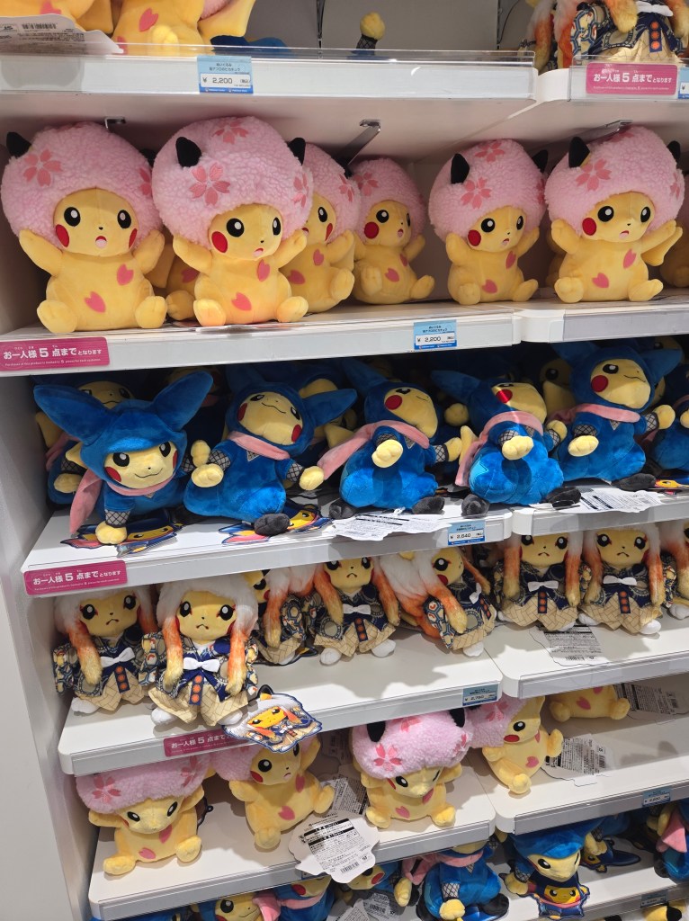 The second store I went to was the Pokémon Center DX in Nihombashi, a very posh area. To get to this center you travel up an elevator and are greeted by enormous Snorlax and Pikachu. This location is also where you can find the Pokémon Cafe, though I did not have time to put in a reservation and go see it for myself. This location I think probably had the widest selection of merchandise from what I could tell. All the newest items were available as well as many discounted products, different card packs and accessories. They had almost every single plush Pokémon from the Pokémon collection arranged in perfect order according to its pokedex number along a giant display. They also had a variety of exclusive Pikachu plushes that I didn’t spy at any of the other stores I visited.