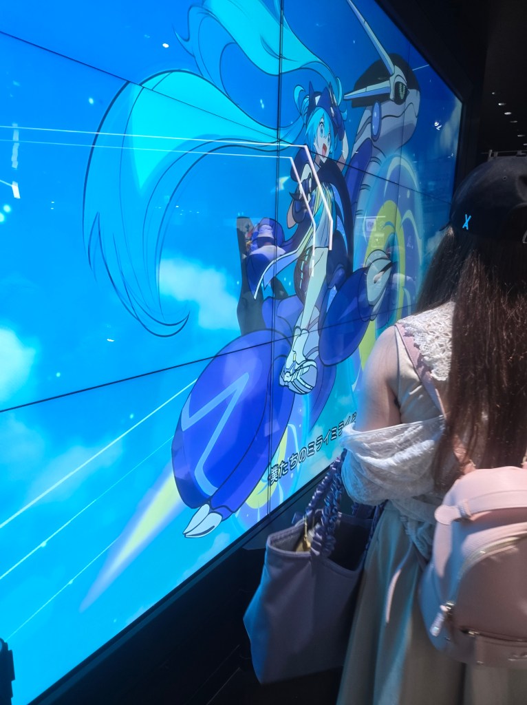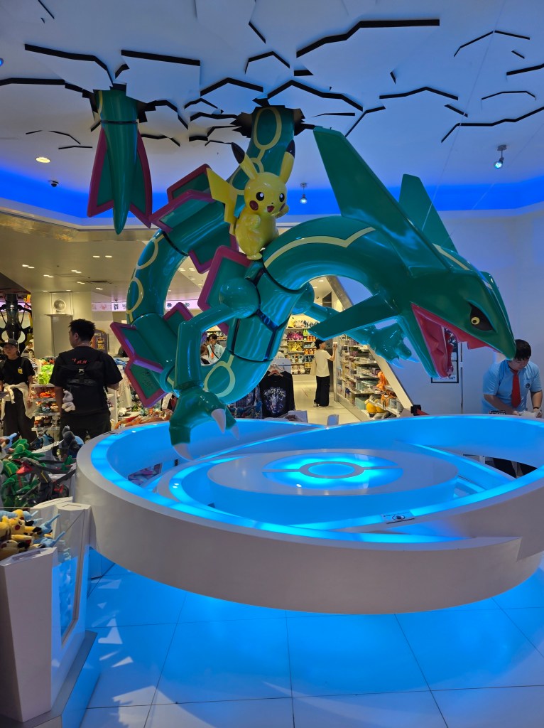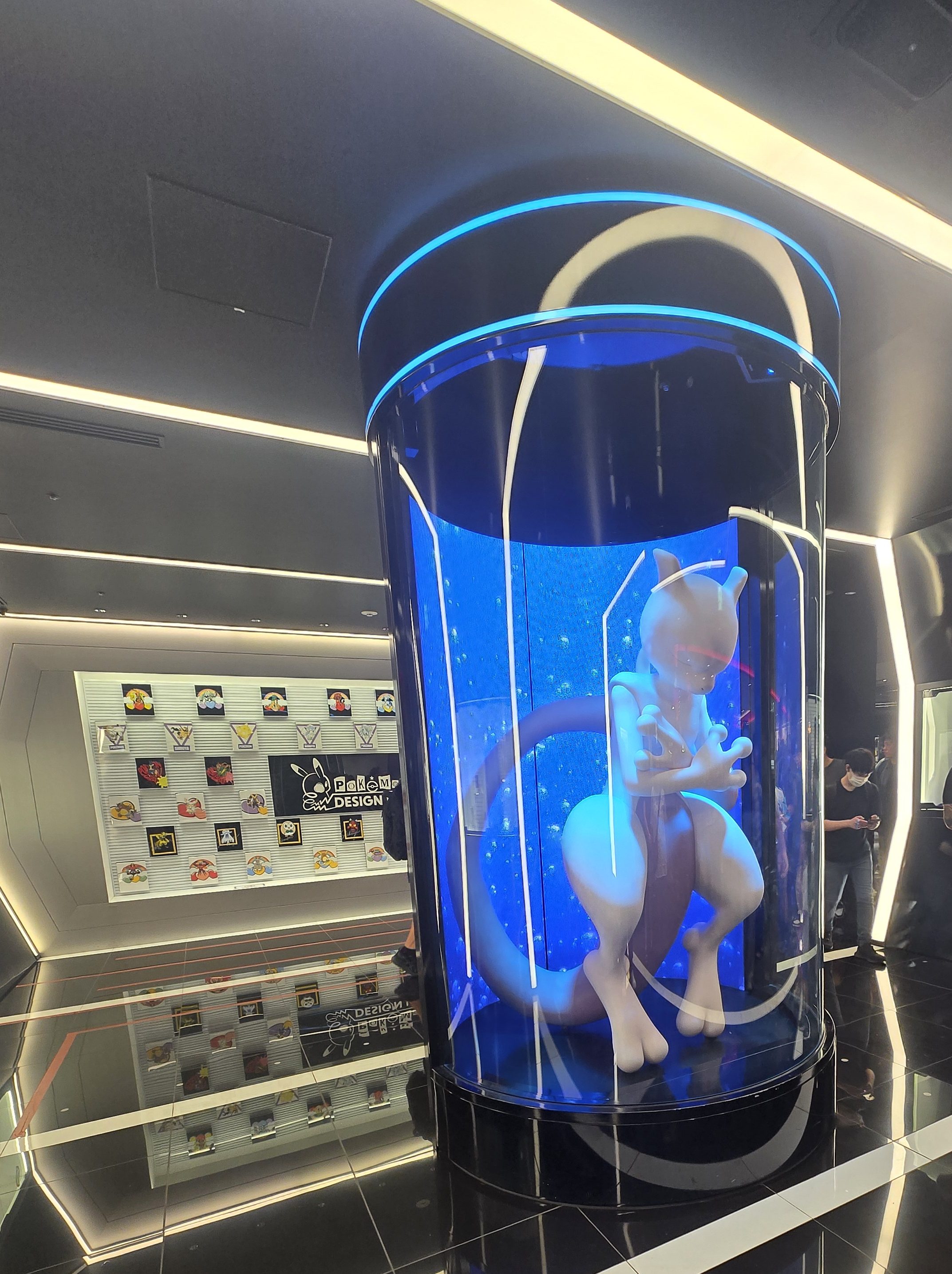 Gently I made my way towards escalators that carried me to the upper floors, doing my best to flow with the large crowds that seemed to move like schools of fish through the halls. I passed the One Piece and Godzilla stores, both swarming with guests. A few more shop fronts later and I peeked over the crowds to see what I had come for in front of me, glowing and powerful looking, the infamous Mewtwo. It was a sight to behold as a Pokémon fan, like a movie scene come to life.